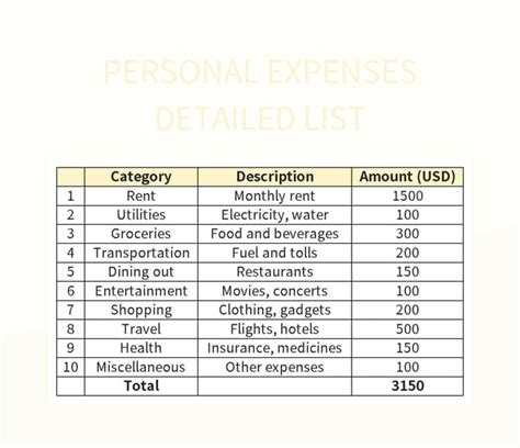 personal expenses list examples